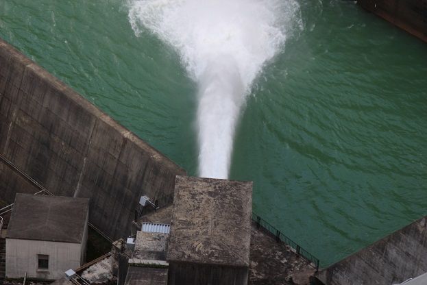 ダム直下流の大町発電所では、 選択取水設備からの放流水により